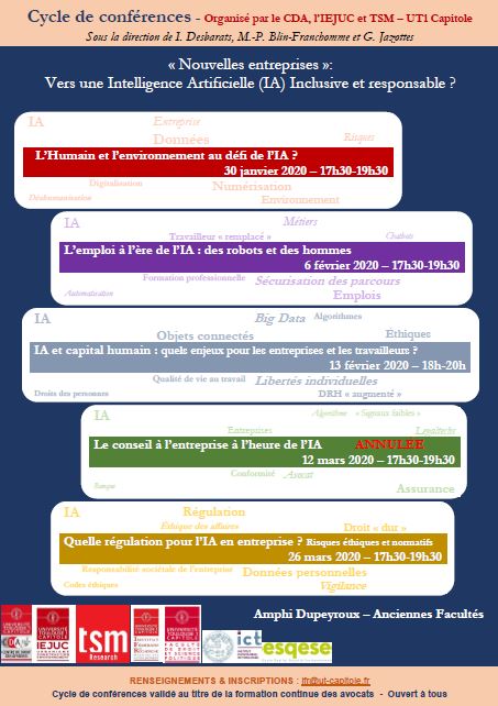 Responsables scientifiques :Le Centre de Droit des Affaires, en partenariat avec l’Institut des Études Juridiques de l’Urbanisme et de la Construction et Toulouse School of Management, organisent un cycle de conférences intitulé « Nouvelles entreprises : vers une IA inclusive et responsable ? ». Alors que l’intelligence artificielle est souvent envisagée au regard de ses applications (en matière de robotique, d’objets connectés ou de programmes apprenants), l’objectif est de l’envisager du point de vue des objectifs qui sont de plus en plus attendus d’elle, en termes d’éthique, d’inclusion et de responsabilité. Il s’agit plus précisément encore de s’interroger sur la façon dont l’entreprise peut contribuer à la réalisation de ce type d’objectifs mais aussi sur les leviers susceptibles d’être actionnés pour y parvenir.