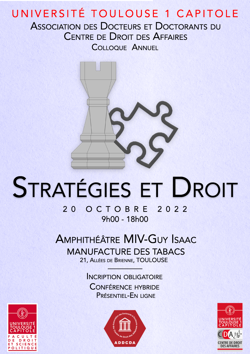 L'Association des Doctorants et Docteurs du Centre de Droit des Affaires (ADDCDA) de l’Université Toulouse Capitole organise un colloque le jeudi 20 octobre 2022 sur le thème "Stratégies et droit". Les spécialistes, chercheurs comme praticiens, souhaitant intervenir sont invités à envoyer candidature avant le 22 mai 2022.