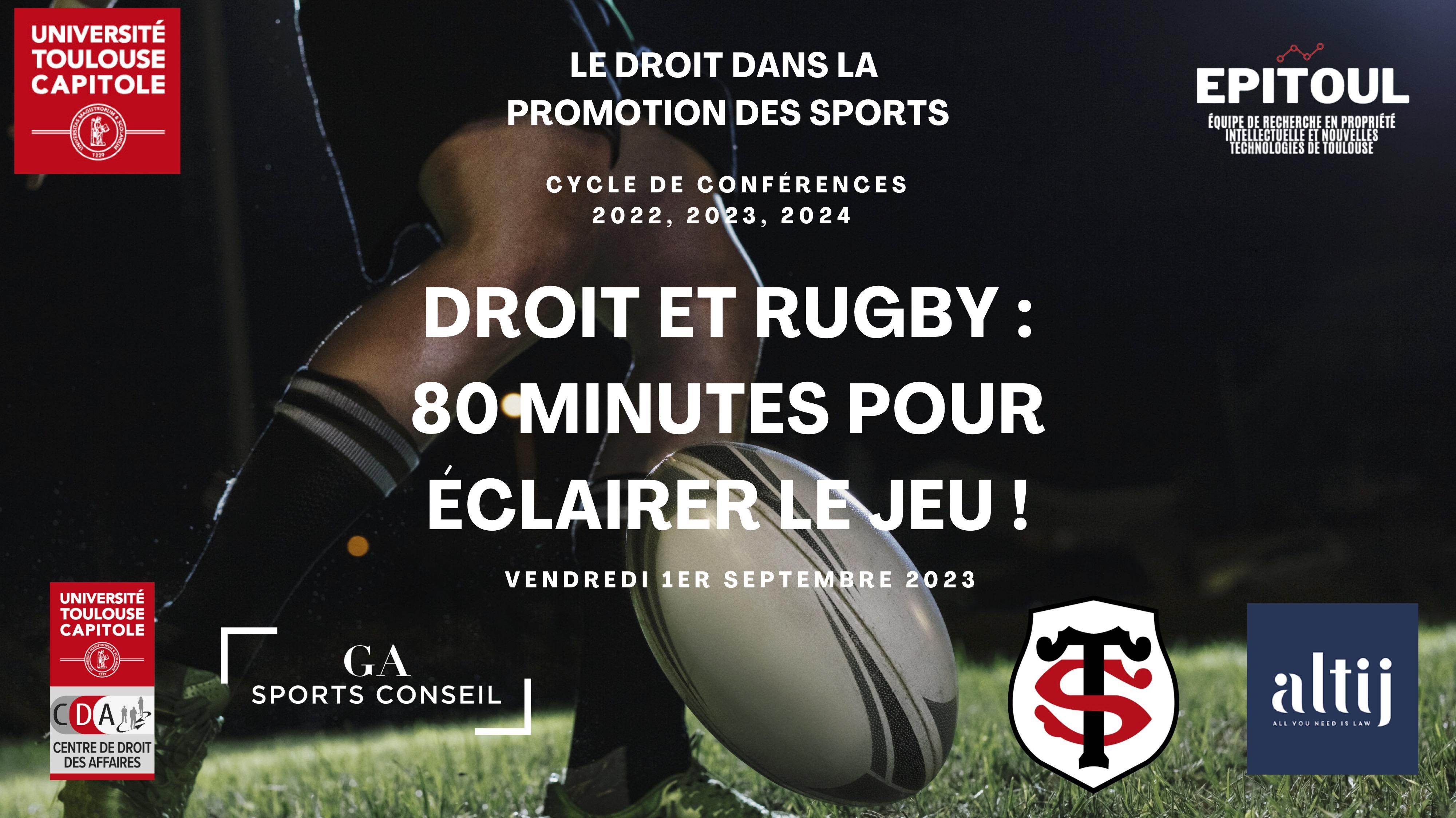 Dans le cadre de son cycle de conférences consacré au "Droit dans la promotion des sports", l'équipe de recherche EPIToul (CDA) propose de faire le point sur le rugby. conférence « Droit et rugby : 80 minutes pour éclairer le jeu ! » permettra d'analyser le rôle du droit des marques, le droit à l'image du joueur, la justice en matière de rugby ainsi que la valorisation des données. Un grand témoin se joindra à la discussion !