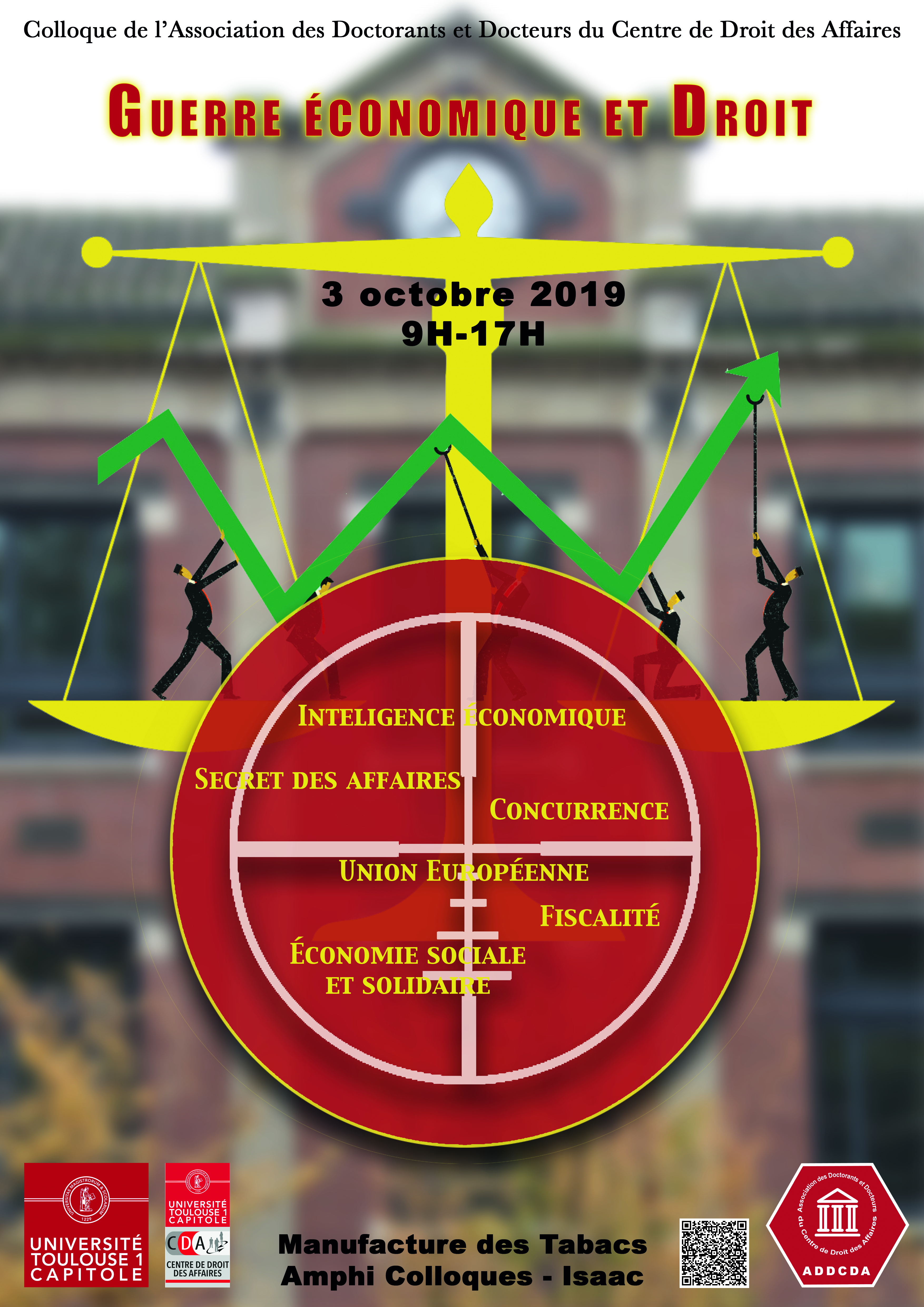 À l’échelle locale, nationale ou internationale, la guerre économique est un sujet d’actualité. Il serait intéressant d'étudier l’appréhension juridique des différents conflits économiques que se livrent les opérateurs de marché ainsi que les États. Il s’agira de se demander quelles sont les influences de ces conflits sur le droit et si le droit est un instrument qui alimente ou qui pacifie cette situation. L'analyse du droit positif ainsi que des travaux législatifs et doctrinaux permettra d’apporter une ou plusieurs réponses à ces questions. »