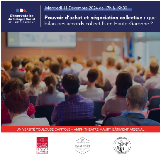 L'Observatoire du Dialogue Social de la Haute-Garonne et l'Université Toulouse Capitole vous donnent rendez-vous le mercredi 11 décembre 2024 de 16h30 à 19h30 pour la conférence : "Pouvoir d'achat et négociation collective : quel bilan des accords collectifs en Haute-Garonne ?".