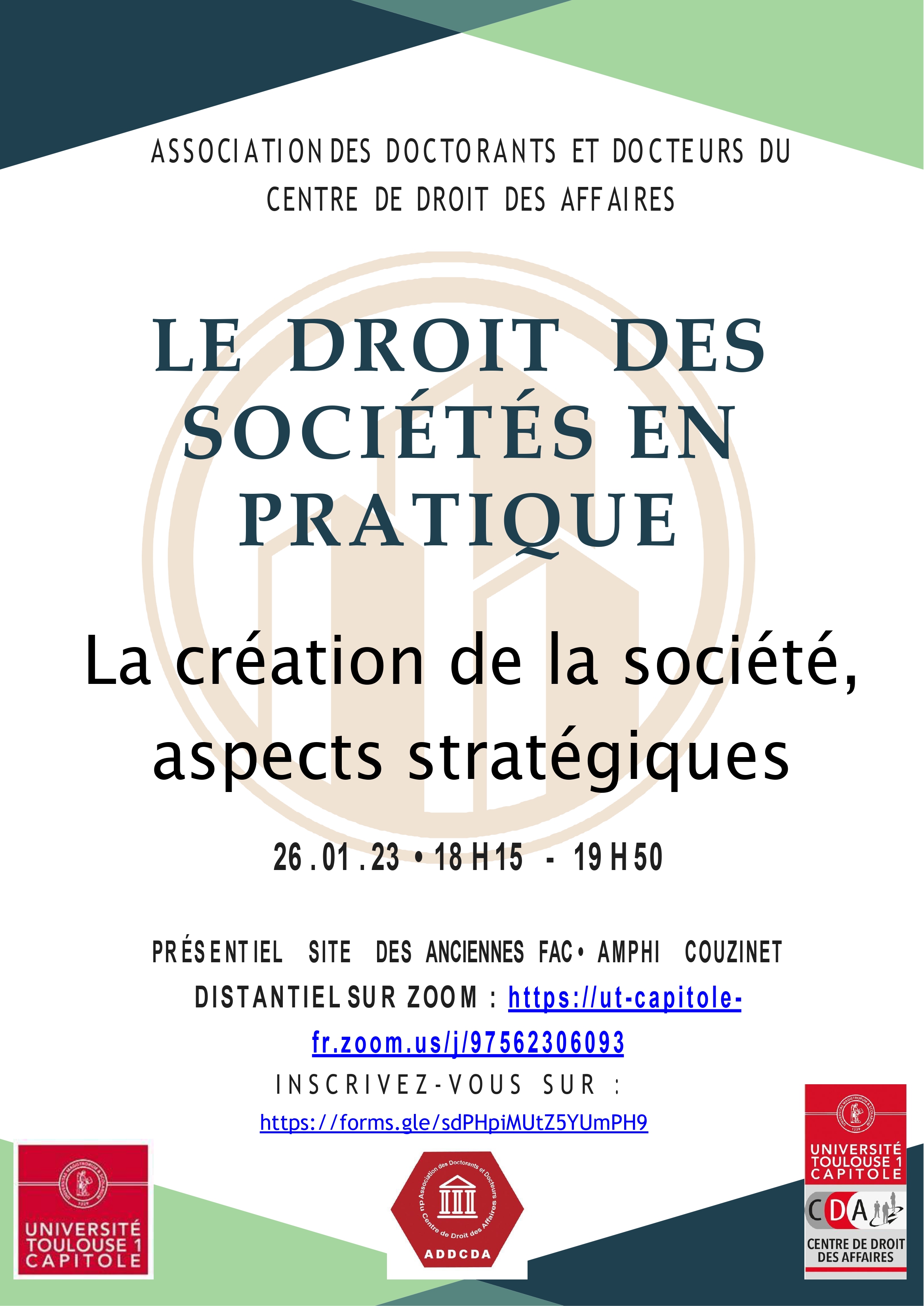 L'Association des Doctorants et Docteurs du Centre de Droit des Affaires (ADDCDA) de l’Université Toulouse Capitole organise la première conférence de son cycle sur la thématique "La création de la société, aspects stratégiques".