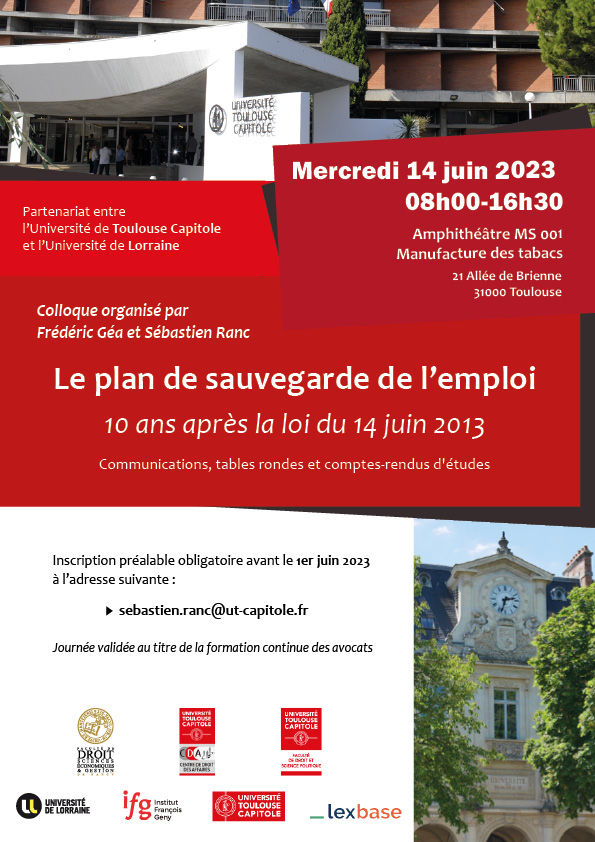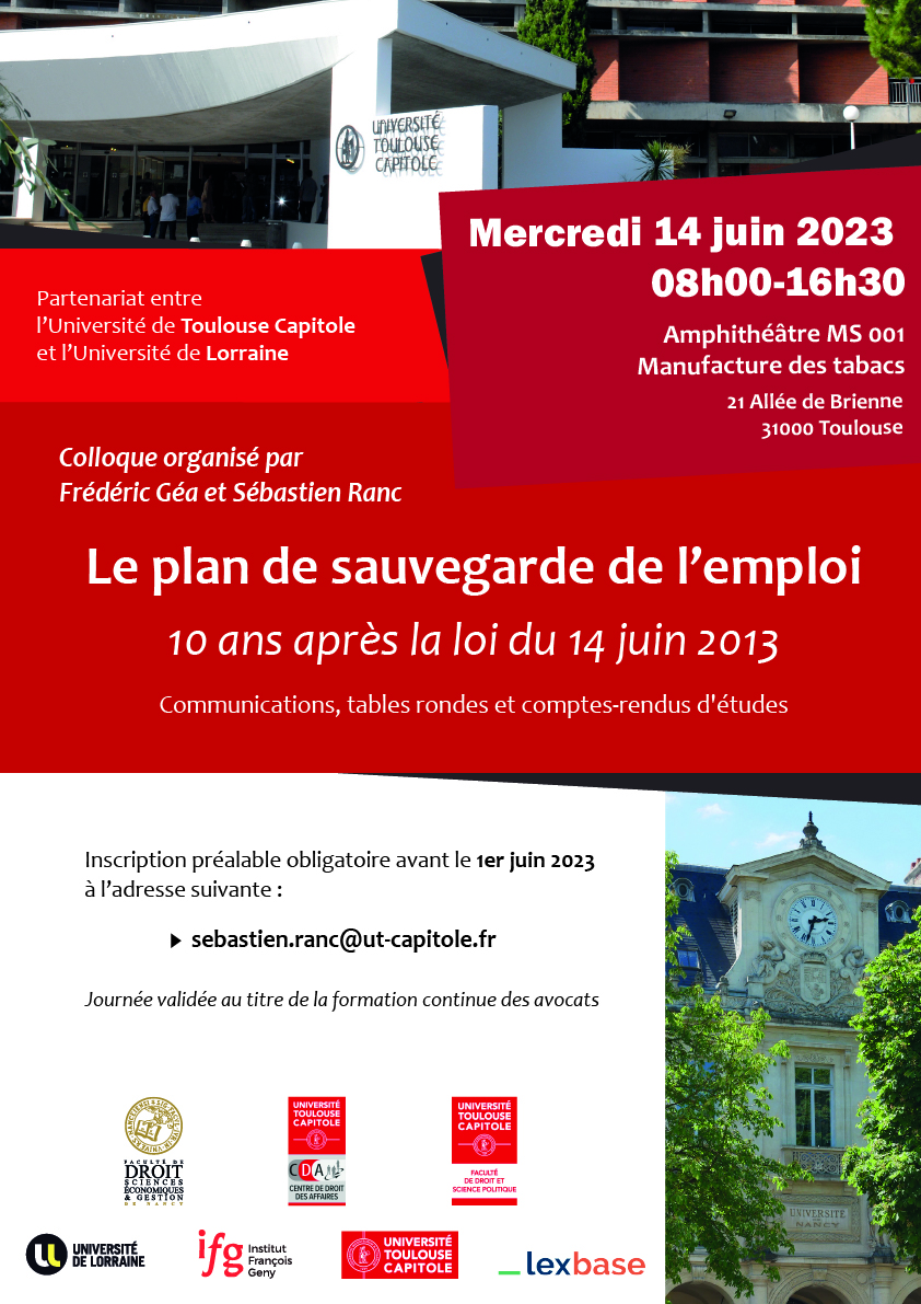 En partenariat avec l'Université de Lorraine, l'Université Toulouse Capitole (Centre de Droit des Affaires) organise le 14 juin, sur son campus, un colloque sur le Plan de Sauvegarde de l'Emploi (PSE). Cet événement d'une journée se déroulera sous forme de conférences et de tables rondes animées par des experts de renom dans le domaine et sera l'occasion pour les professionnels et les étudiants de discuter des évolutions juridiques qui ont marqué les dix dernières années. [Inscription obligatoire].