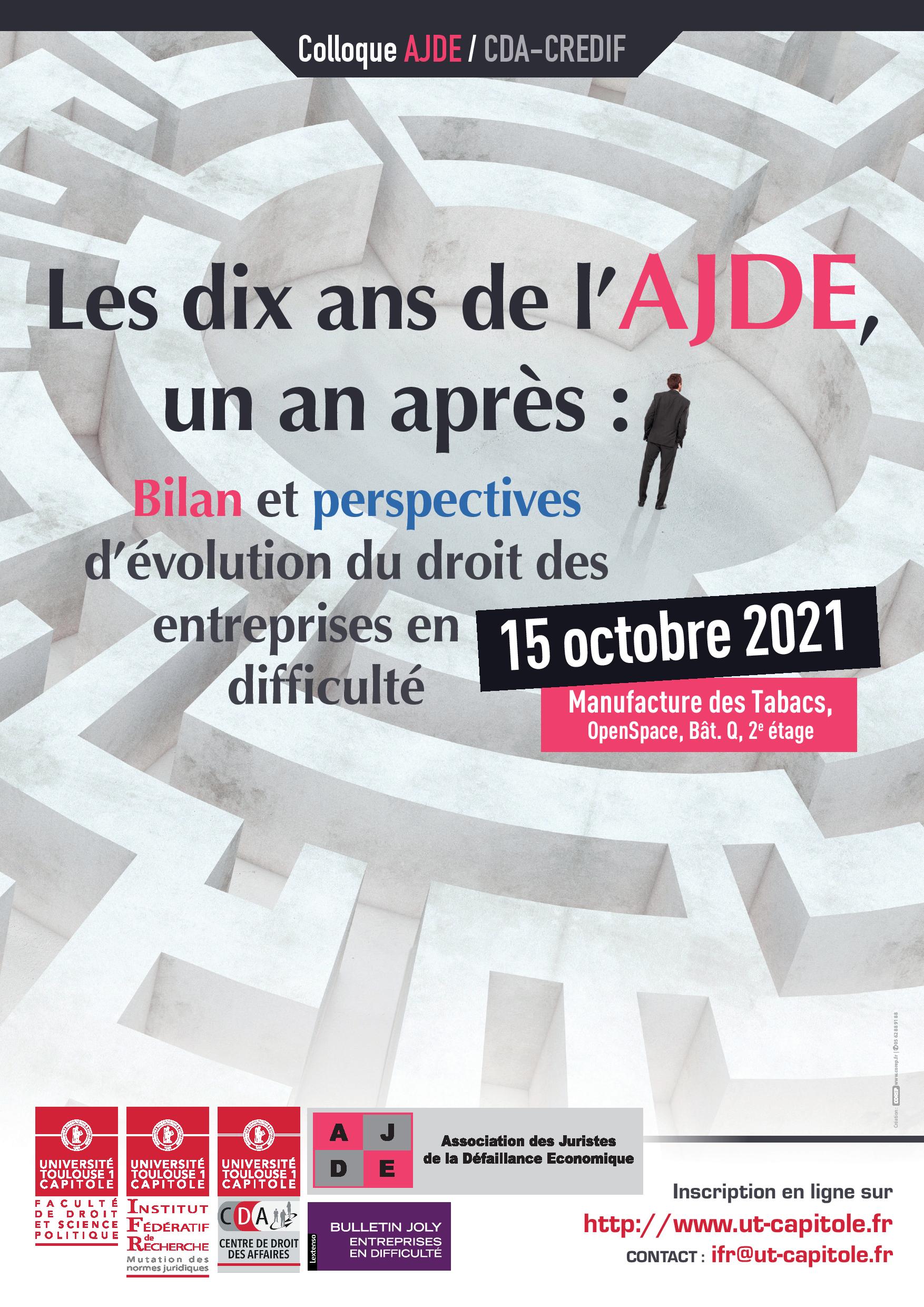L'AJDE a pour objet la promotion de recherches et travaux portant sur la prévention et le traitement de la défaillance économique des entreprises et des particuliers tant en droit interne qu’en droits étrangers. Au sein du Centre de droit des affaires de l'Université de Toulouse Capitole, le CREDIF organise chaque année, au mois d'octobre, en partenariat avec l'AJDE, un colloque sur un thème lié à l'actualité du traitement de la défaillance des entreprises.