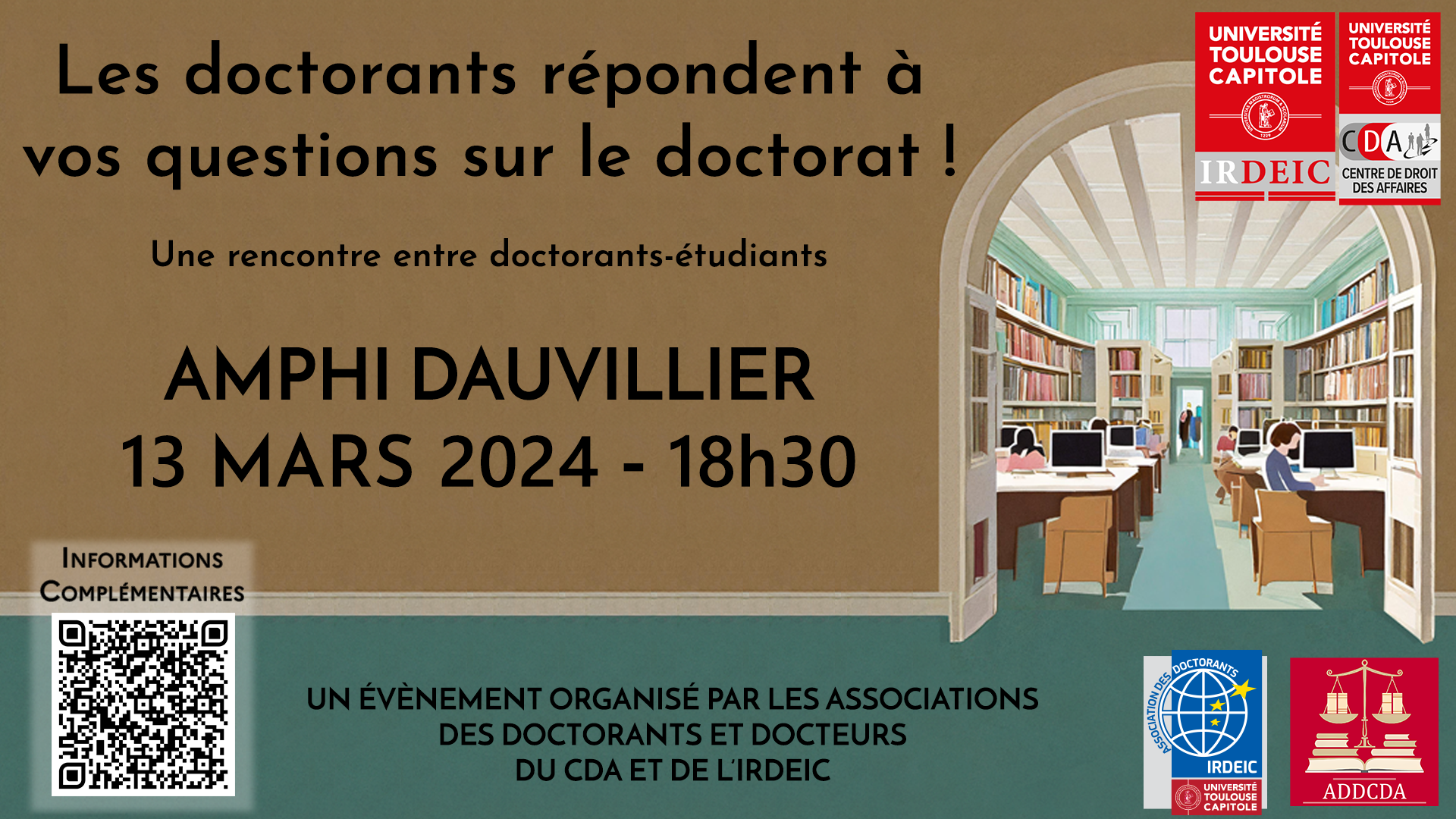 La rencontre aura lieu en amphi Dauvillier le 13 mars 2024 à 18h30 et est ouverte à tout étudiant(e) intéressé(e) par la question du doctorat. Après un court mot d'introduction les doctorants présents seront invités à venir à la rencontre du public pour briser la glace.