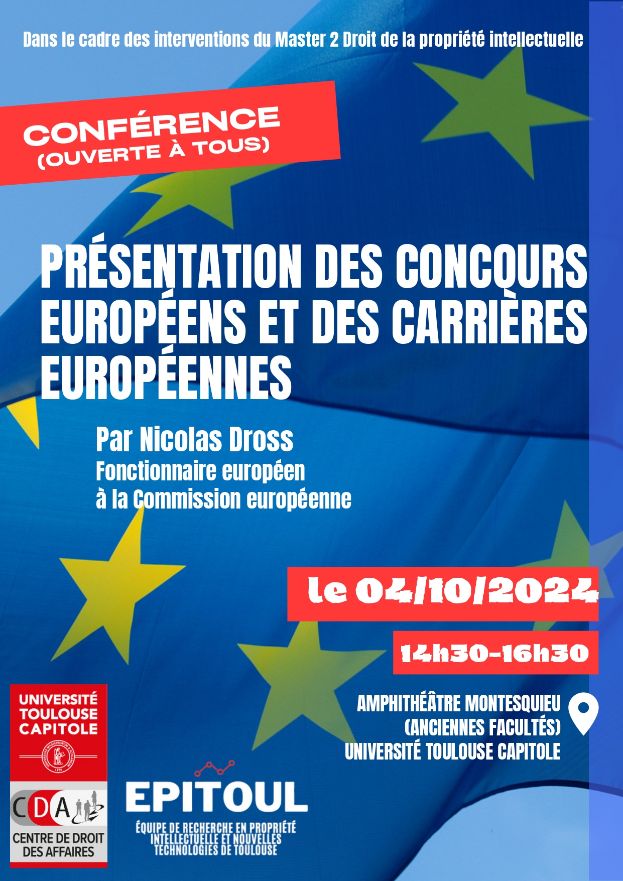 La conférence "Présentation des concours européens et des carrières européennes" aura lieu le vendredi 4 octobre 2024. Cette conférence est organisée par le CDA et le master 2 Droit de la propriété intellectuelle.