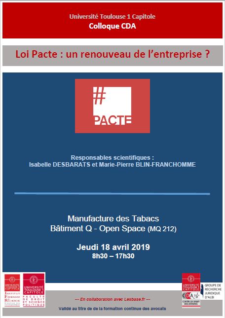 "Loi Pacte : un renouveau de l'entreprise ?", actes du colloque organisé par le CDA- EJERIDD