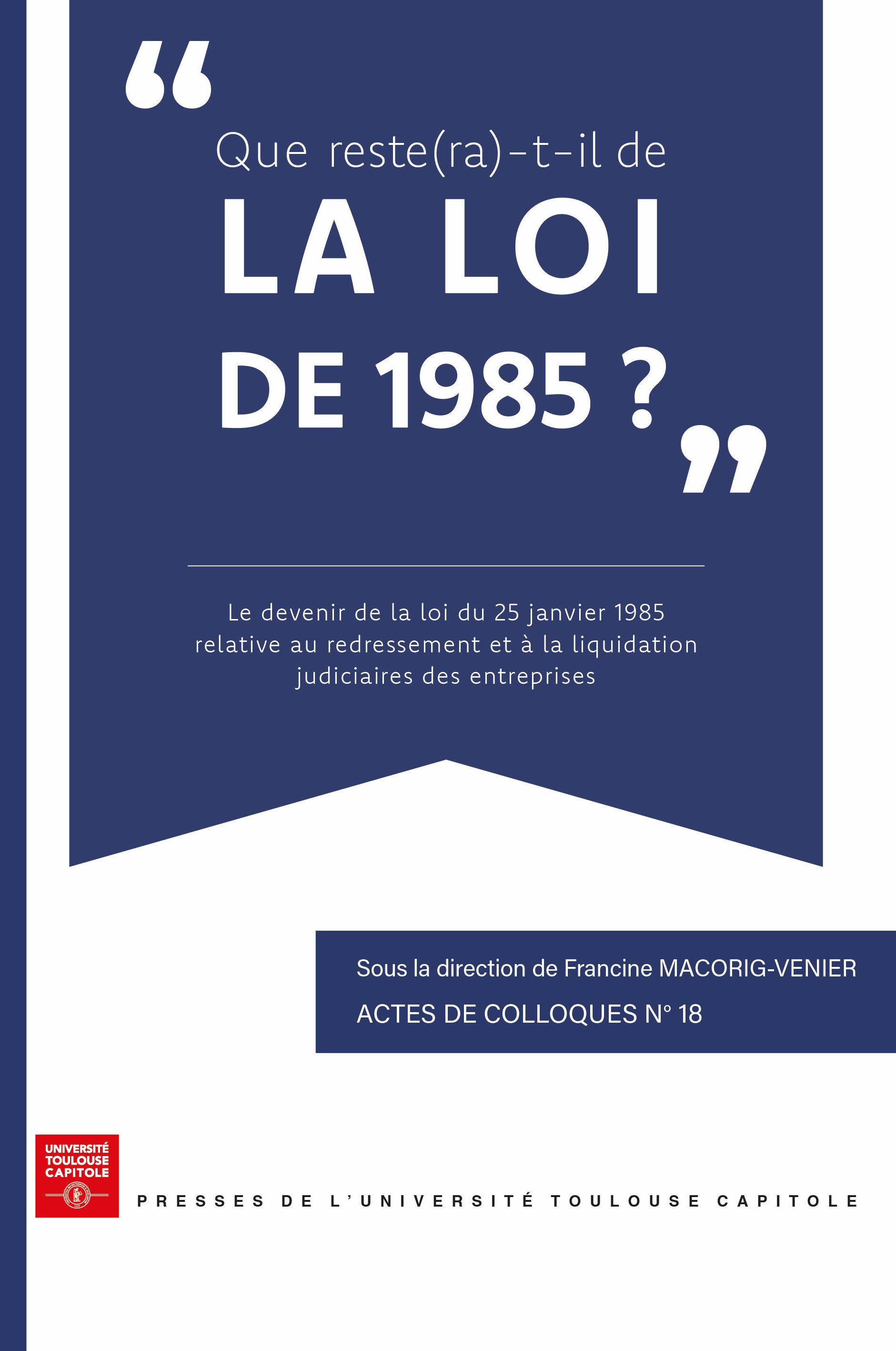 Quarante ans après l’adoption de la loi n° 85-98 du 25 janvier 1985 relative au redressement et à la liquidation judiciaires des entreprises qui transforma le droit des faillites en droit des entreprises en difficulté, il est apparu pertinent de s’interroger sur ce qu’il reste aujourd’hui de ce texte fondateur et sur ce qu’il serait susceptible d’en rester demain, alors même qu’une nouvelle réforme se profile. Les actes du grand colloque consacré à cette loi, organisé par la faculté de droit de Toulouse en 1986 sous la houlette du professeur Corinne Saint-Alary Houin, actes publiés dans les Annales de l’université (Tome XXXIV), ont constitué le point de départ de cette réflexion qu’a éclairée le professeur Antoine Lyon-Caen, qui œuvra à la rédaction de la loi de 1985 et fut le grand témoin du présent colloque dont la direction scientifique a été assurée par Francine Macorig-Venier, professeur à l’École de droit de l’Université Toulouse Capitole, responsable de l’axe Droit de la défaillance économique du Centre de Droit des affaires.